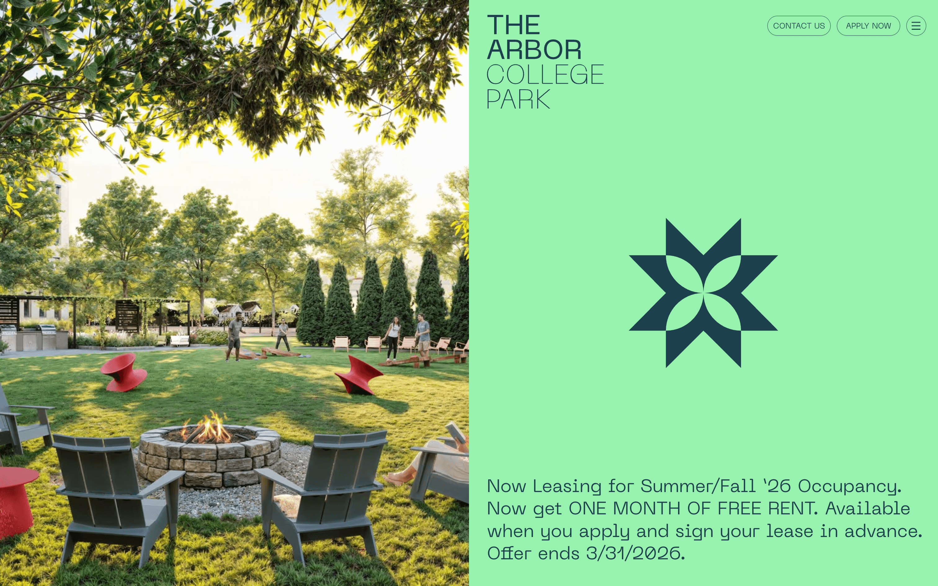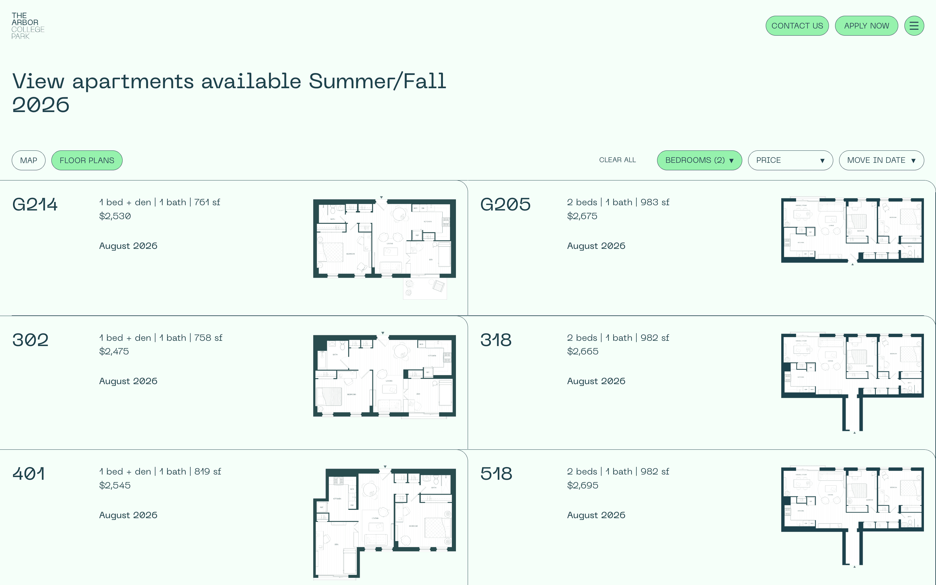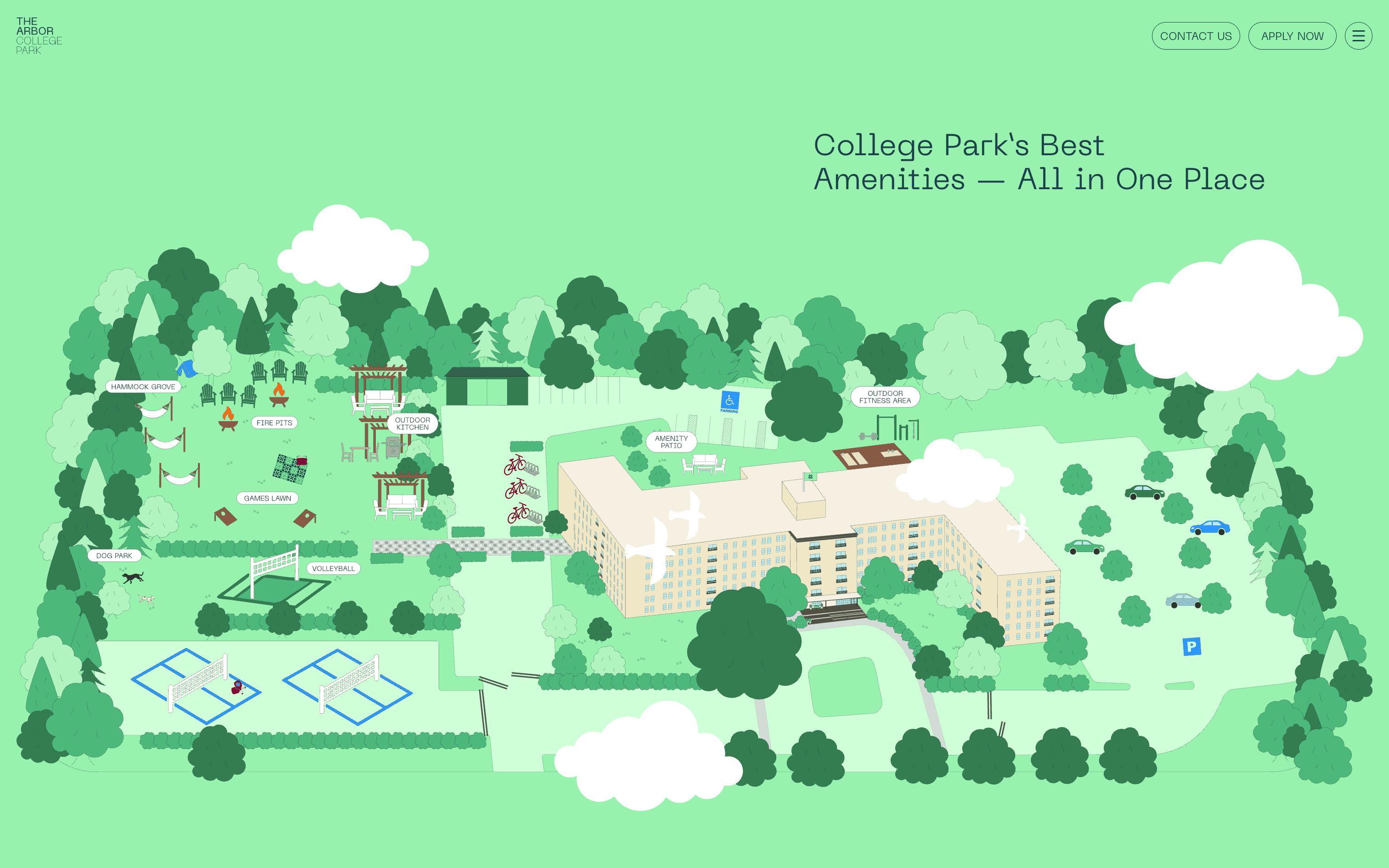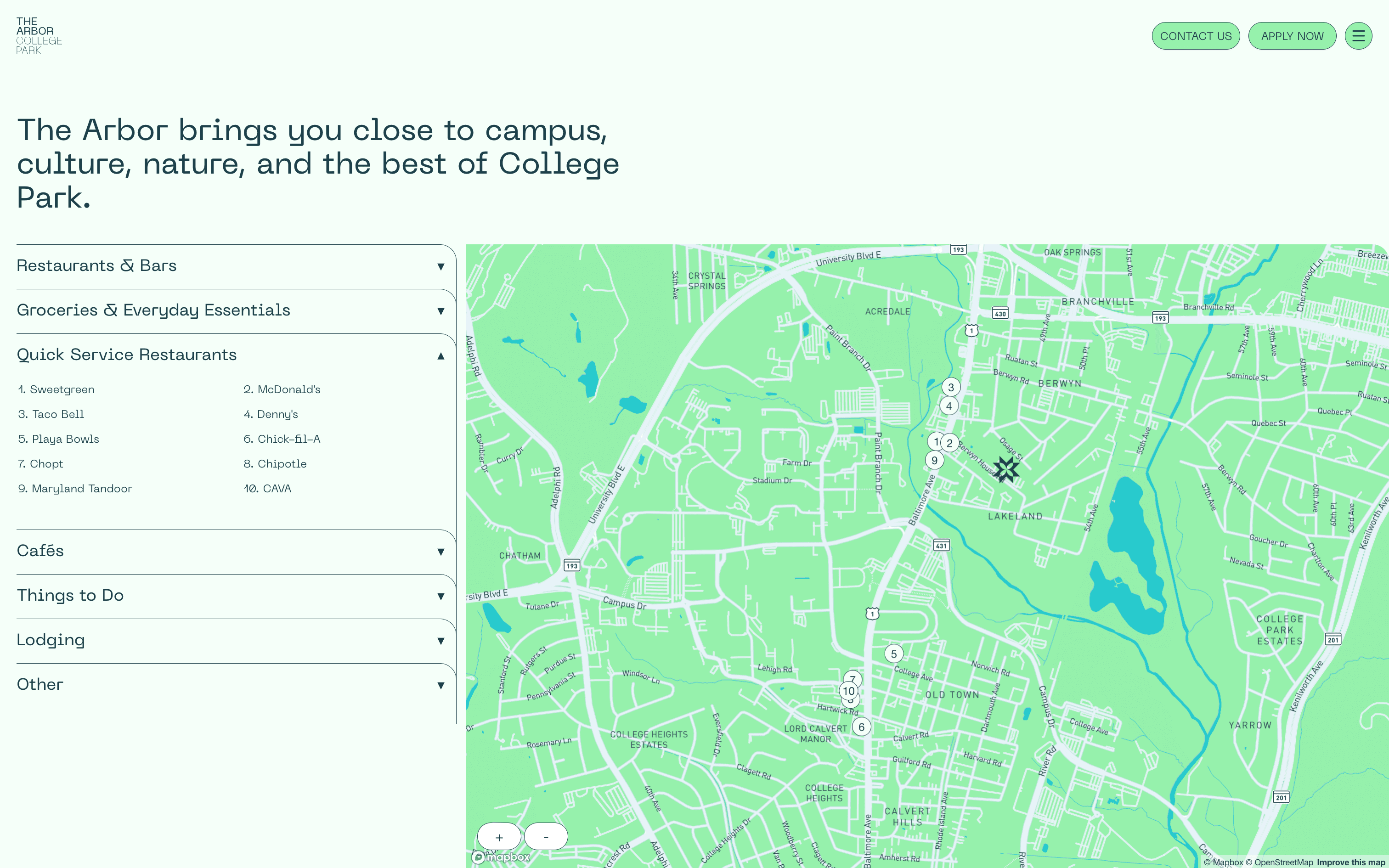 Digitale Leasing-Plattform und Website für Arbor College Park, eine Student-Housing-Community nahe der University of Maryland.